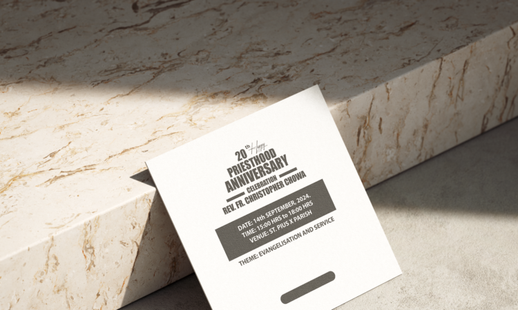Simple anniversary invite design. The invitation announces the 20th Priesthood Anniversary celebration of Rev. Fr. Christopher Chowa, that took place on 14th September, 2024 at around 15:00 to 18:00 hrs at St. Pius X Parish in Chililabombwe/Copperbelt, with the theme “Evangelisation and Service.” Invitation card designed by Theaomai Graphics team,...